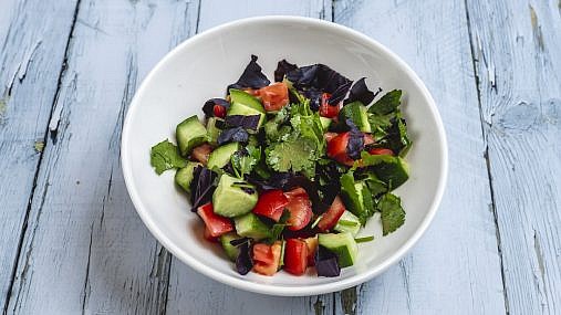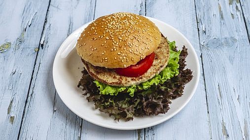 Toyuq kotleti, pomidor, salat, kahı, ketçup